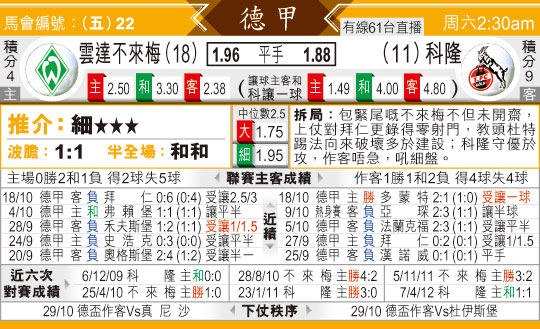 德甲 | 9 | 不来梅 | 0:1(0:0) | 科隆 | 1 | 小 | 平手 | 输 | |